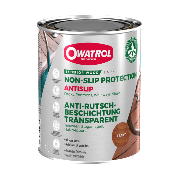 Owatrol Antislip also know as Antigliss has been specially formulated to provide a slip resistant finish to timber decking and other wooded structures such as steps. Owatrol Antislip is a satin finish solvent based coating that offers excellent UV and weather resistance and is suitable for application to properly prepared timber to help prevent the timber from greying.