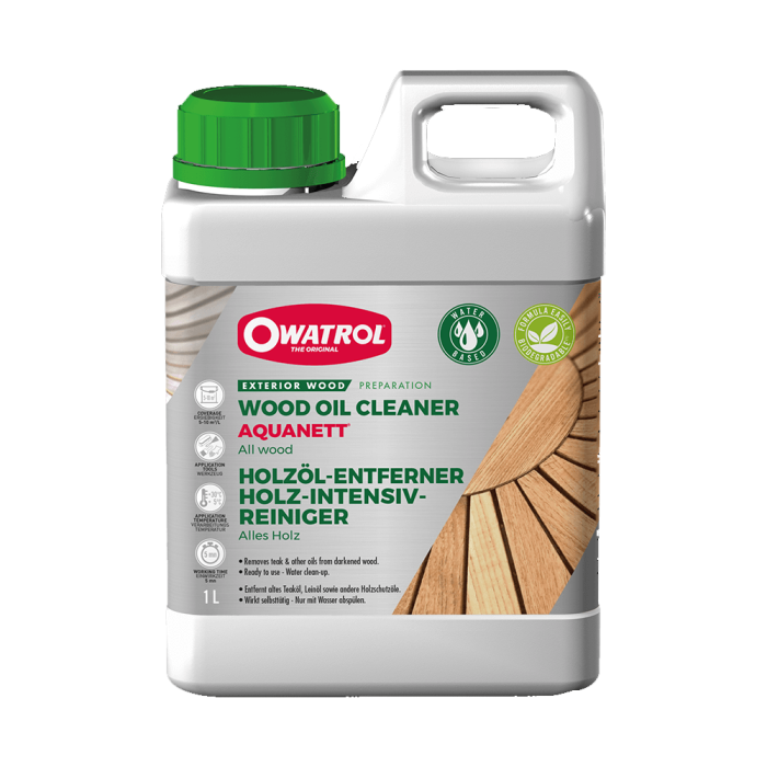 Owatrol Aquanett is powerful ready to use wood oil cleaner formulated to remove all teak oils and other oils from all types of exterior wood, it is perfect to remove oils from both horizontal and vertical timber surfaces such as decking, garden furniture, cladding, timber structures plus many more.