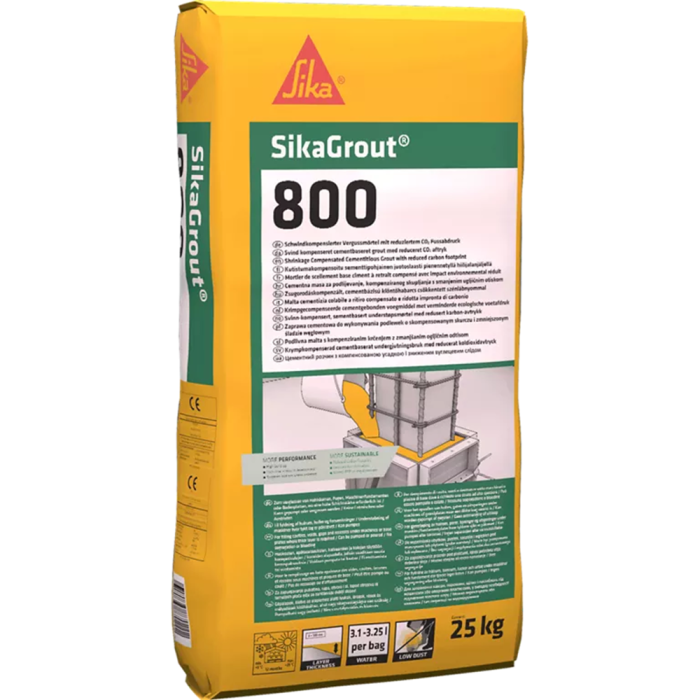 Sika SikaGrout 800 is a cementitious, high-performance, shrinkage-compensated engineering grout. It contains supplementary cementitious materials (SCMs) and can reduce the carbon footprint when compared to a reference cementitious grout in a Life Cycle Assessment. Reaction to fire EuroClass A1.