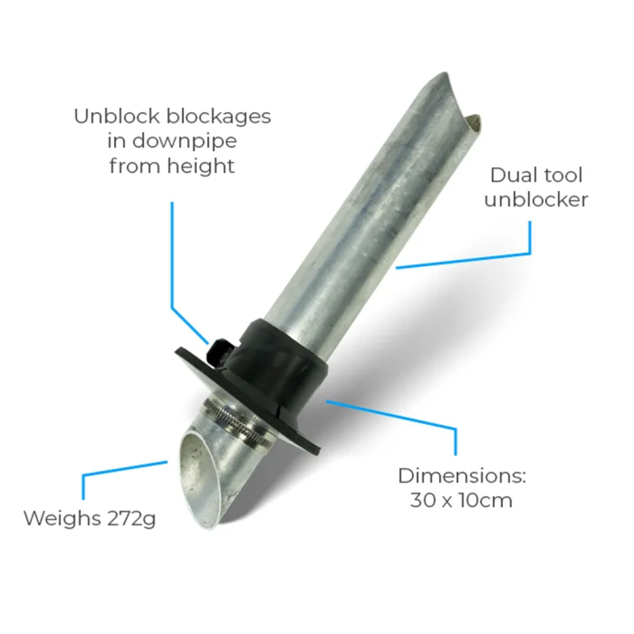 The Dual Unblocking Tool is the ideal addition to your SKYVAC system. Suitable for a variety of gutter types, this tool will swiftly clear out leaves, twigs, and other debris that can impede water flow from down pipes.